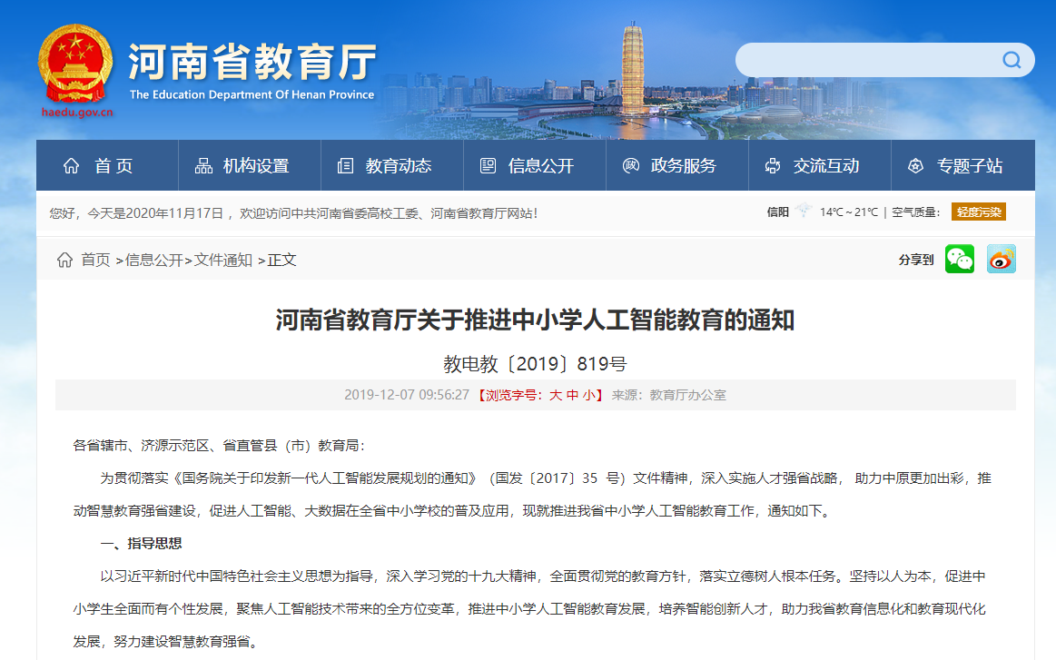 为贯彻落实《国务院关于印发新一代人工智能发展规划的通知》(国发〔2017〕35 号)文件精神,深入实施人才强省战略, 助力中原更加出彩,推动智慧教育强省建设,促进人工智能、大数据在全省中小学校的普及应用,现就推进我省中小学人工智能教育工作,通知如下。