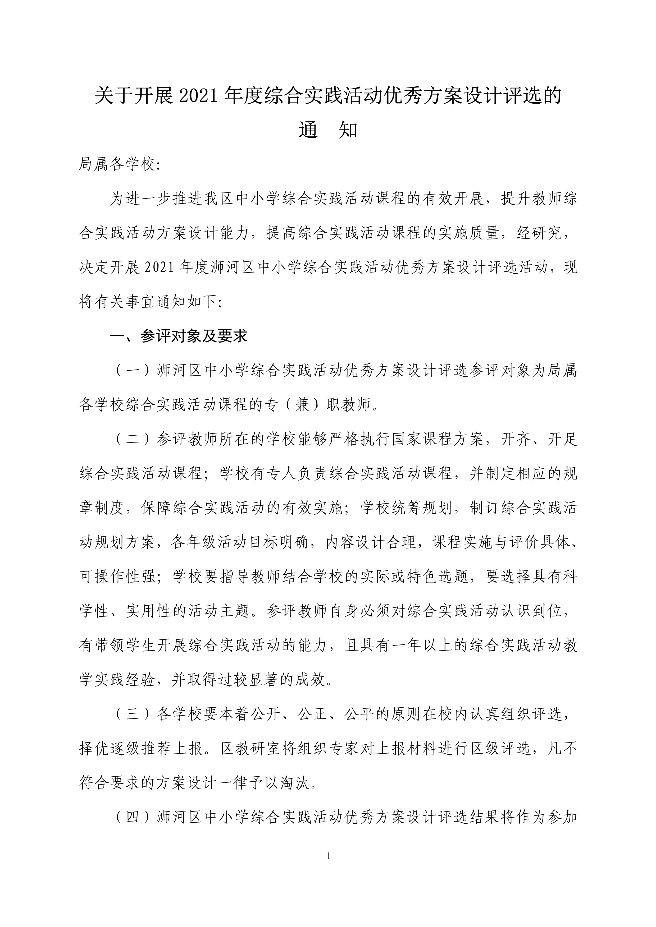 关于开展2021年度综合实践活动优秀方案设计评选的通知