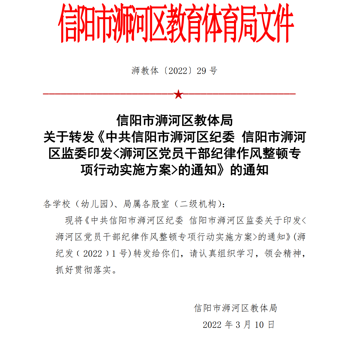 经区纪委常委会会议研究,并报区委同意,现将《浉河区党员干部纪律作风整顿专项行动实施方案》印发给你们,请认真组织学习,严格贯彻执行。